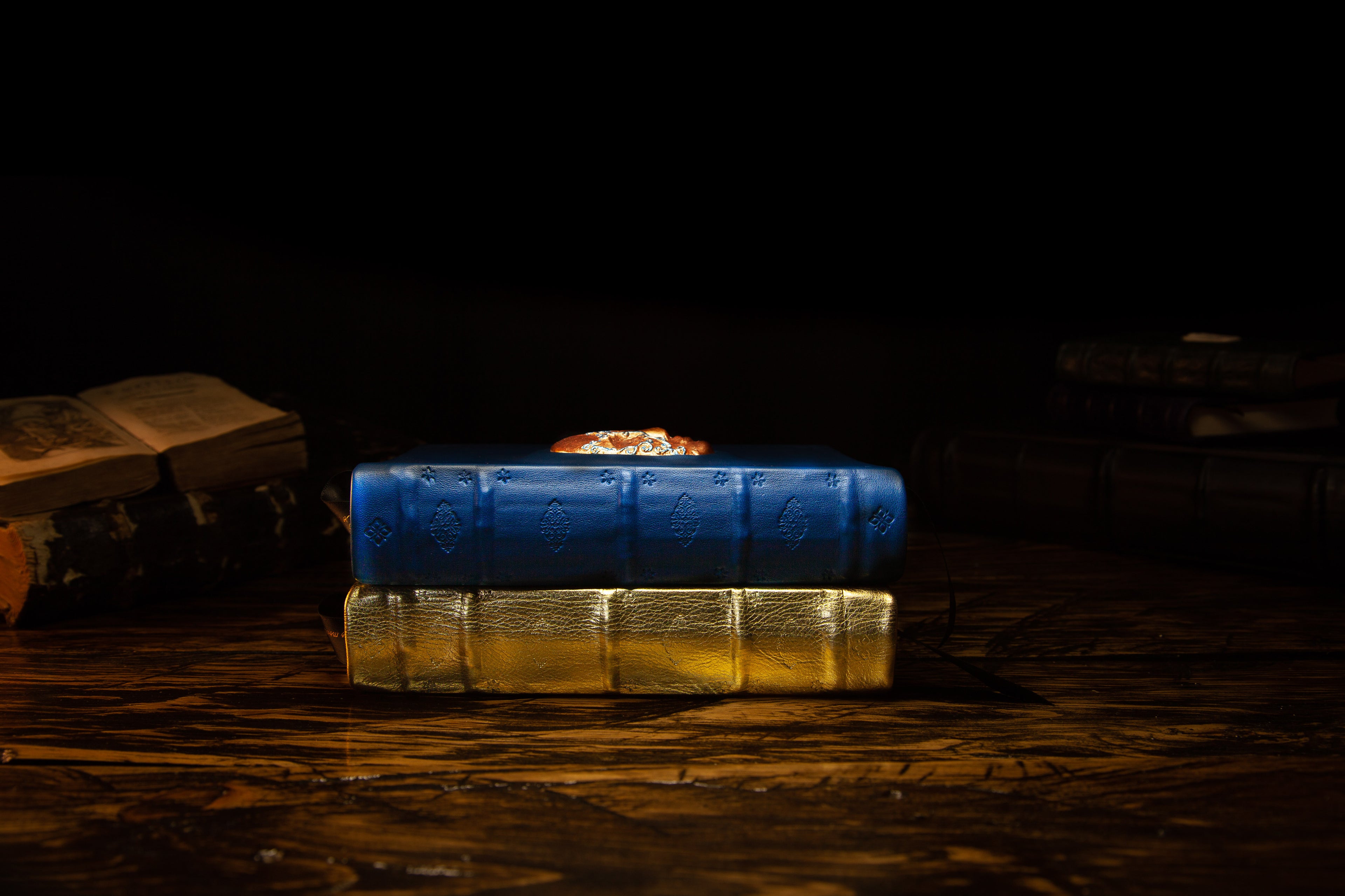 wrapped in premium Italian calf leather and adorned with intricate blind tooling in historical patterns.